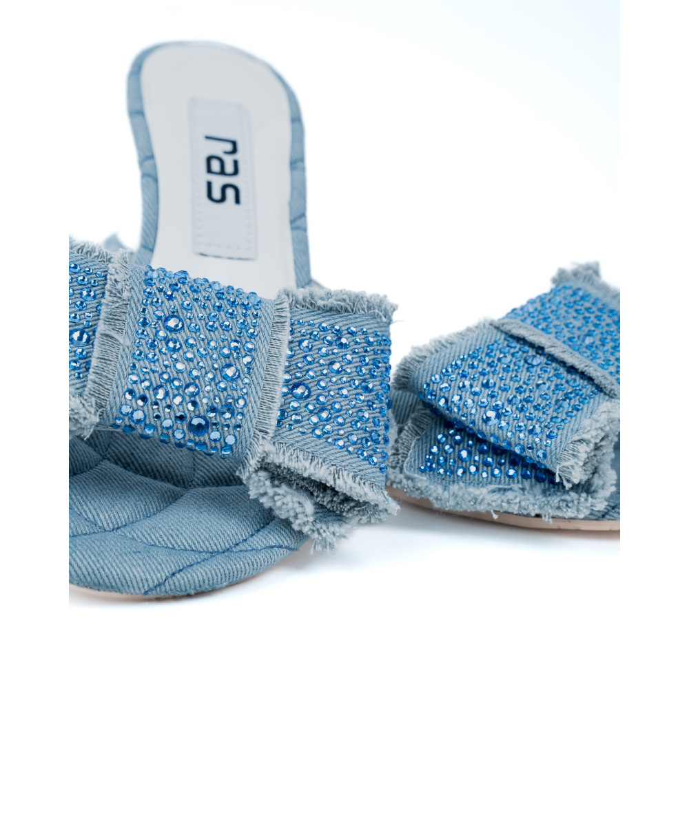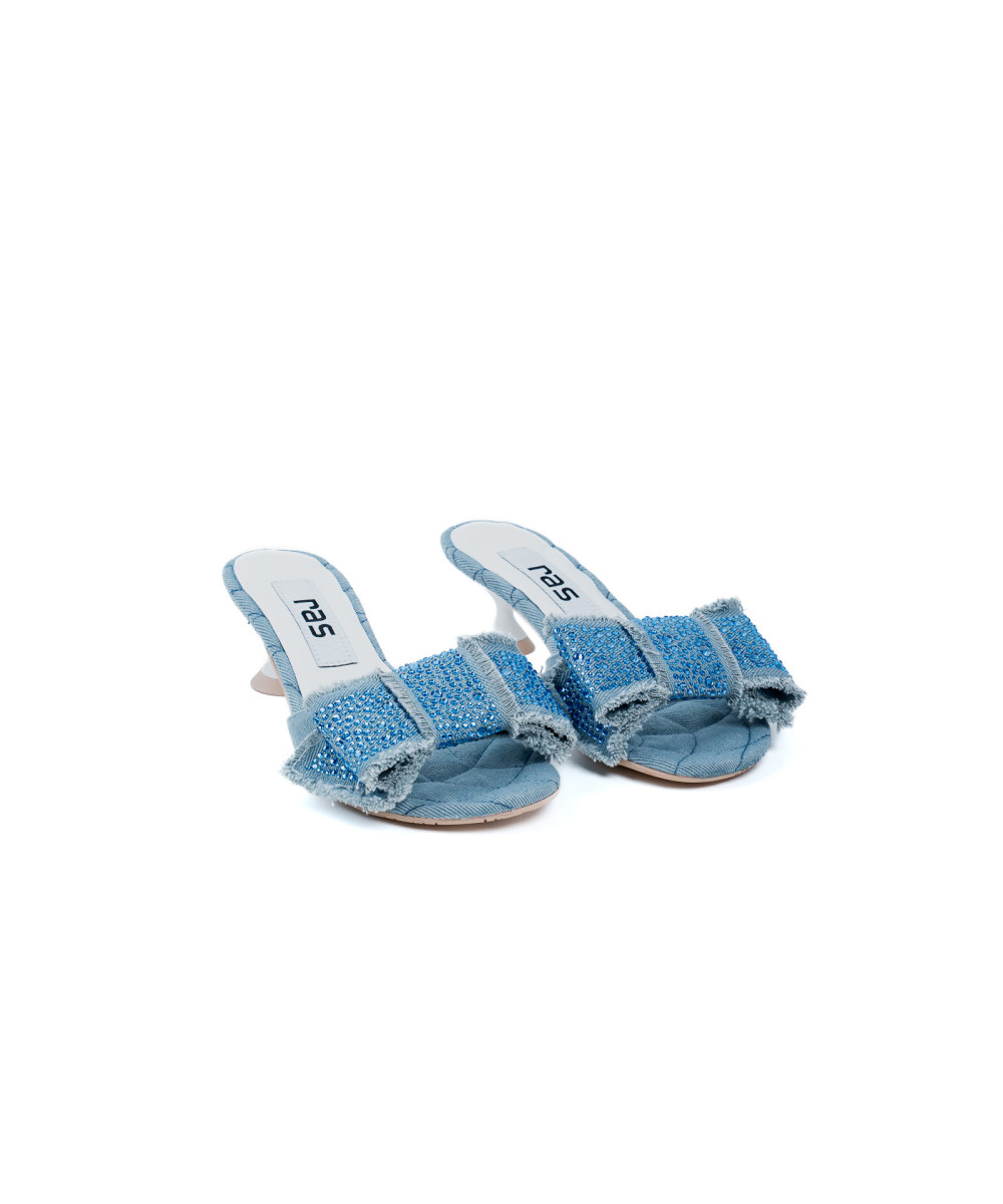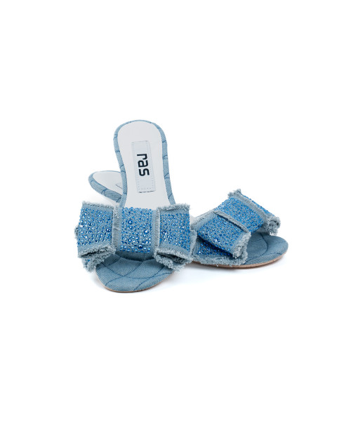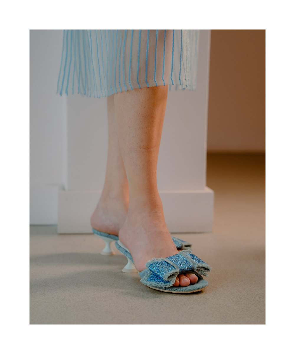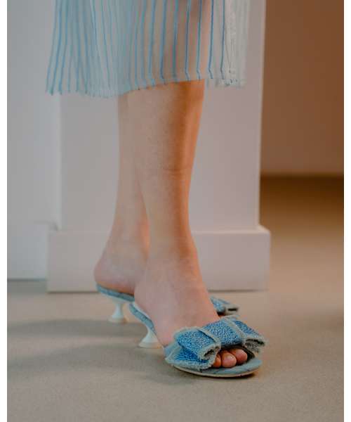 Sky blue slingback sandals made from denim fabric. This original design is decorated with a striking maxi bow at the front. It also features a low heel with a slight curve.