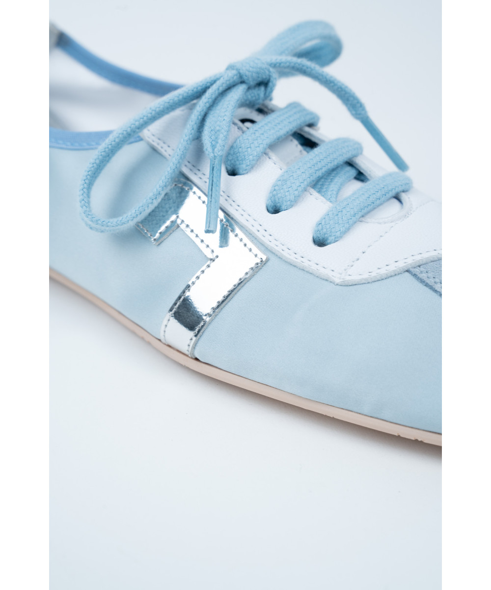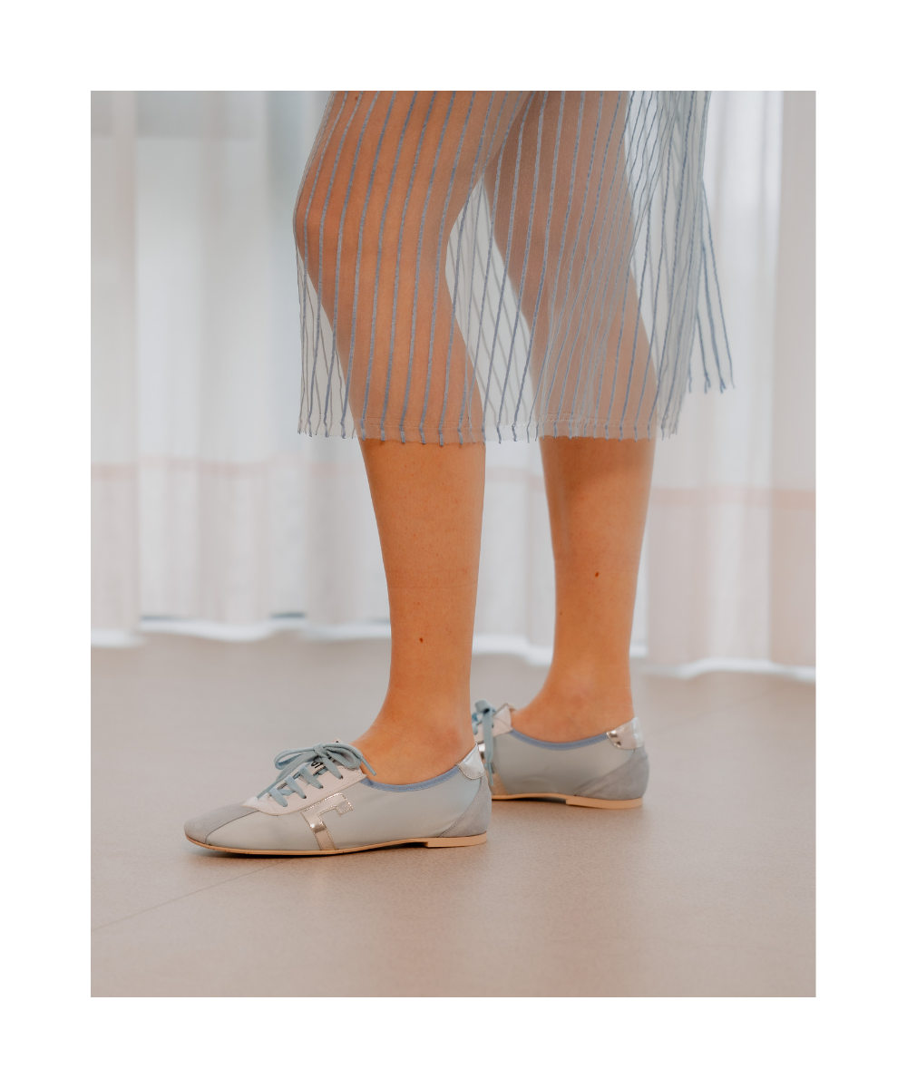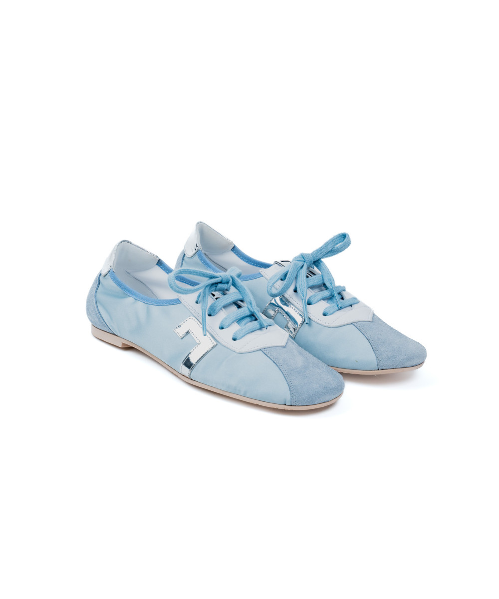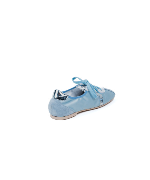 Sky blue leather shoe. Designed with an elegant round toe, this shoe features metallic embellishments on the sides. It is an adjustable shoe with laces. It stands out for its comfort and lightweight sole.