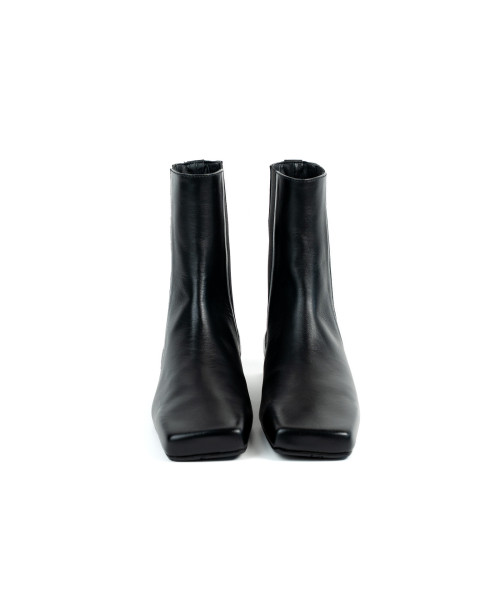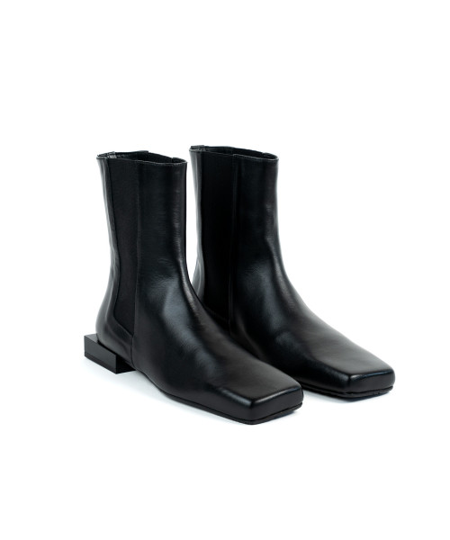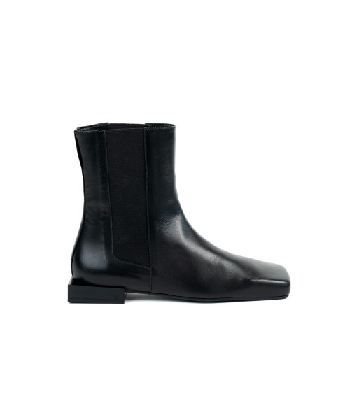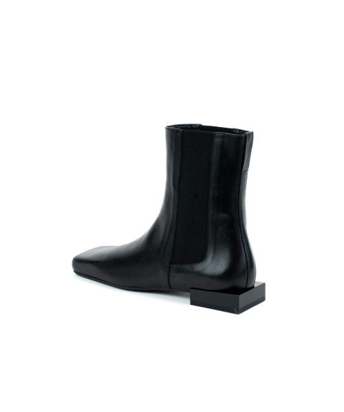 Black leather ankle boots. Designed with an elegant square toe, they feature a square heel. This model is easy to adjust with its elasticated side panels, making them comfortable to wear with a 2 cm mid-height heel.