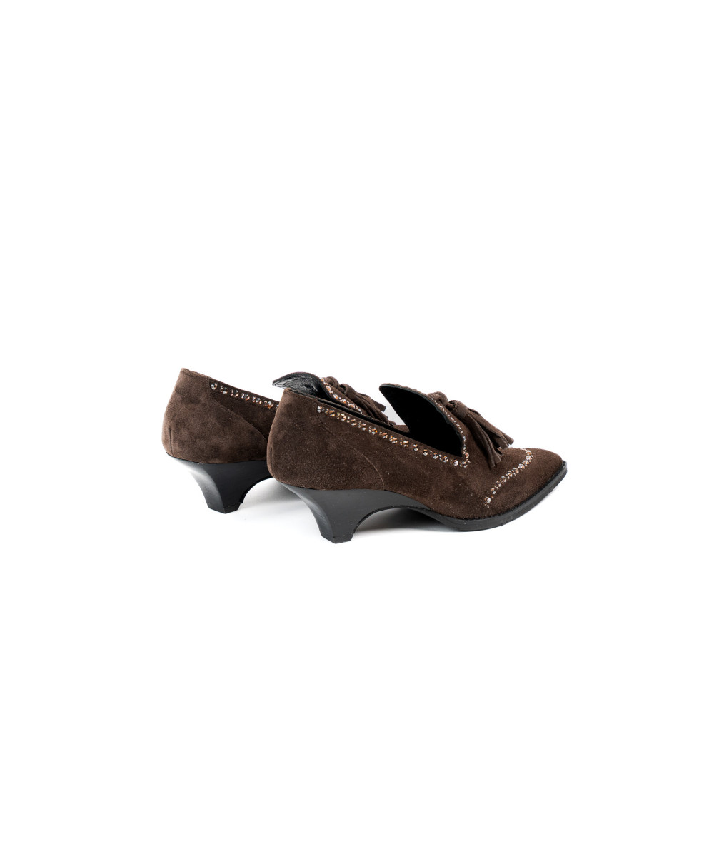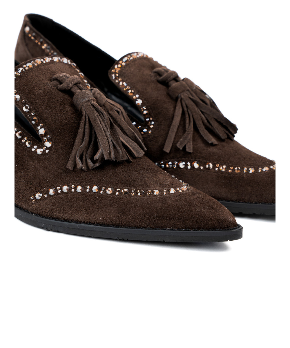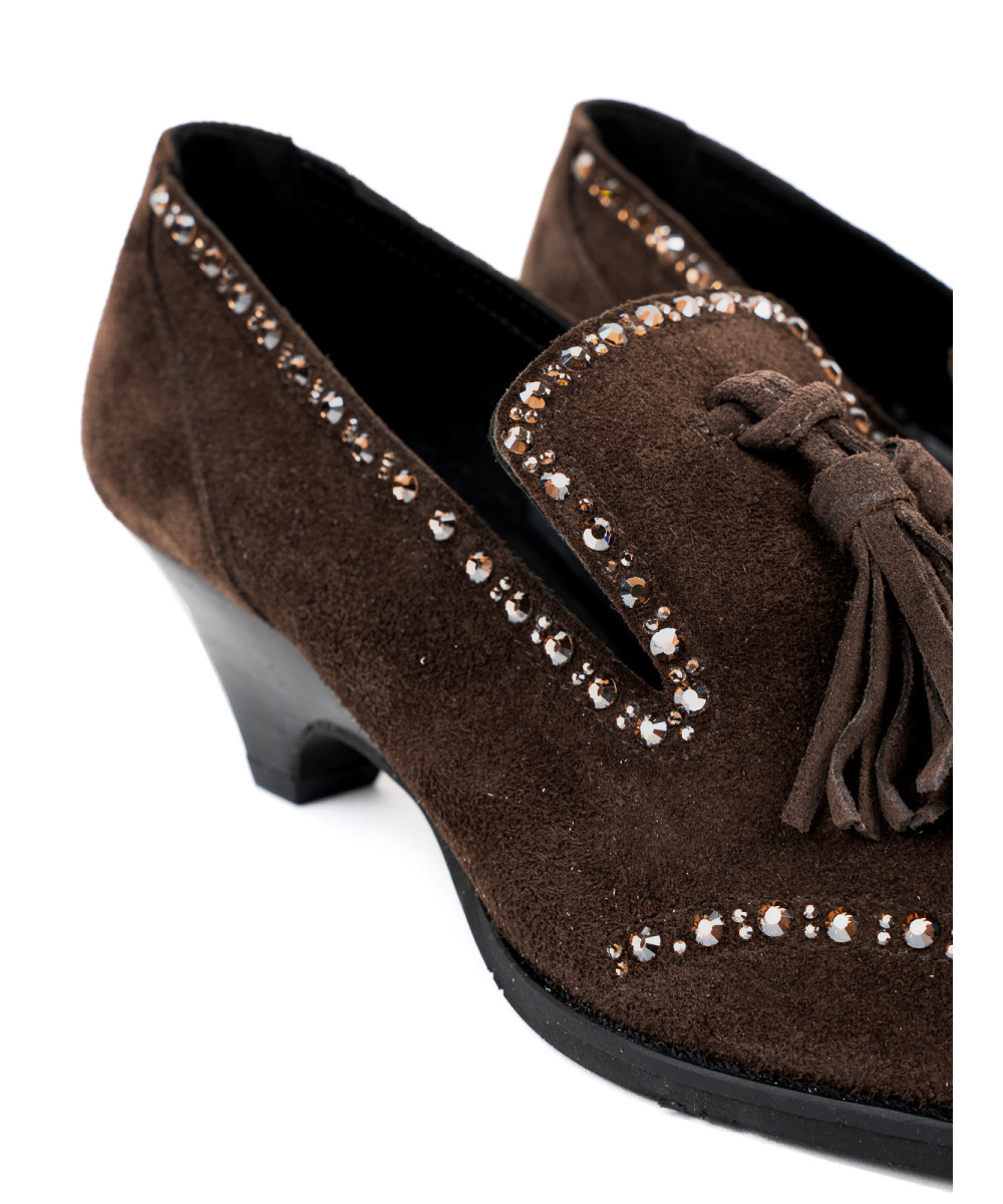 Moccasin made from suede fabric. Designed with an elegant semi-rounded toe, it features decorative design details. This model is easily adjustable for a comfortable fit and comes with a low 2 cm heel.