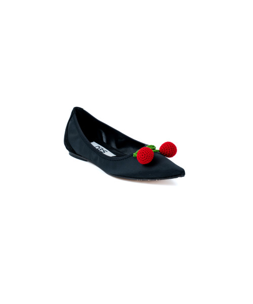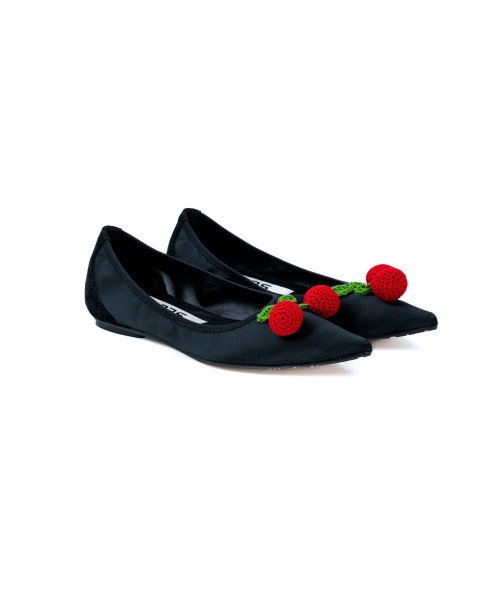 Bailarina de color negro fabricada en piel. Diseñada con una elegante punta en pico, esta bailarina se caracteriza por sus adornos con forma de cerezas elaboradas artesanalmente en rafia. Se trata de de un zapato ajustable, ya que mantiene el calce habitual de la bailarina.
