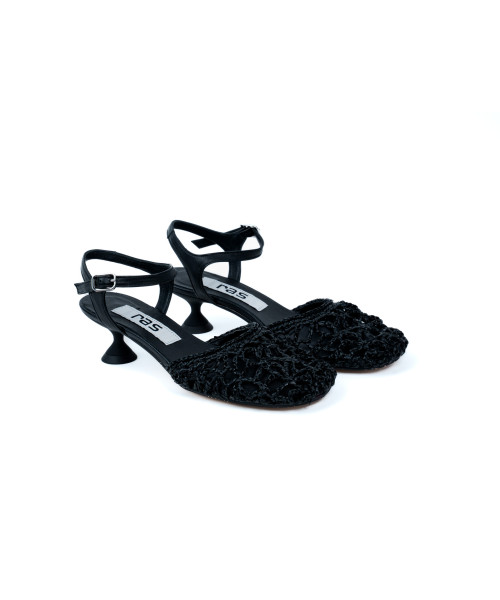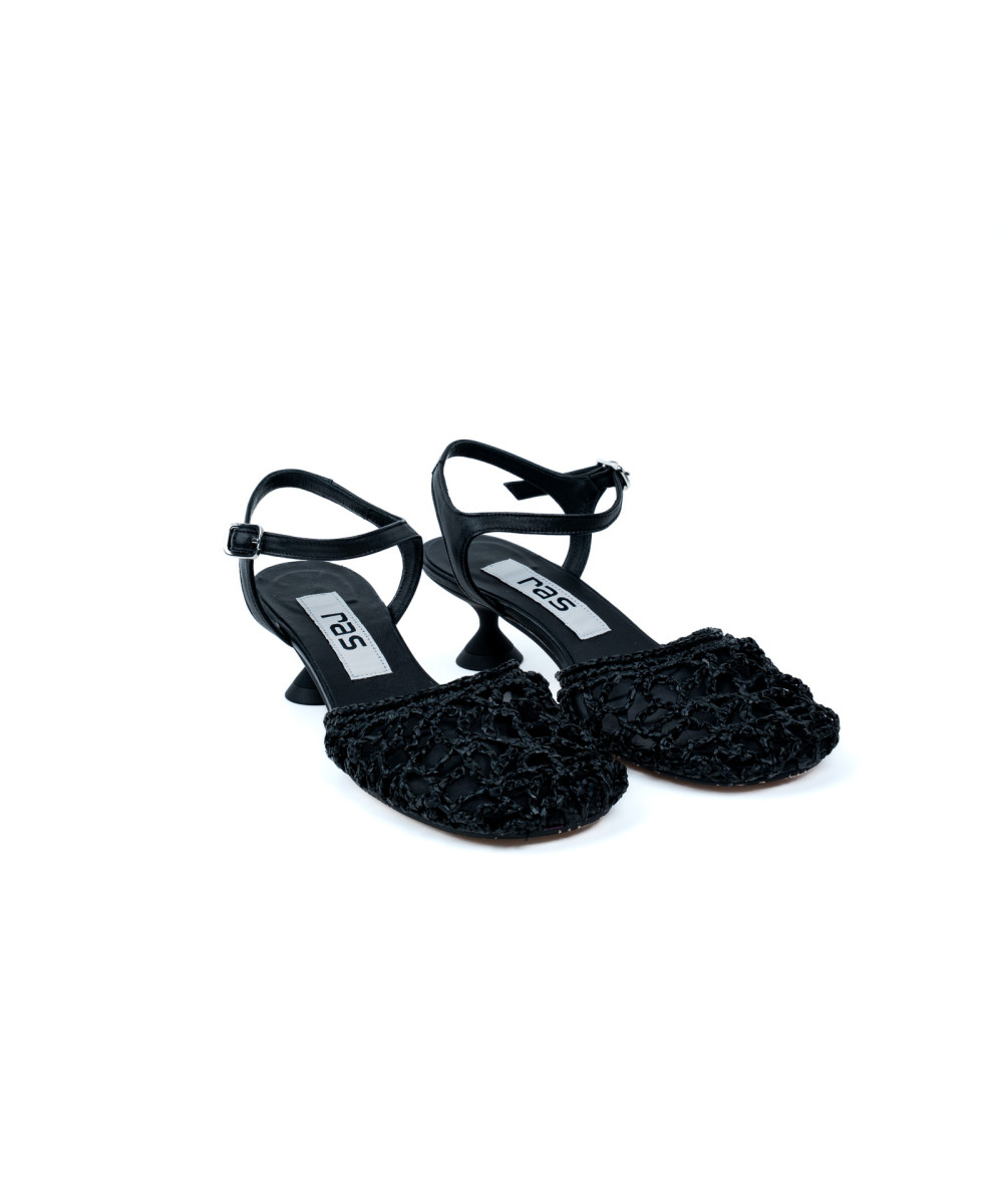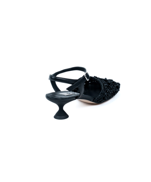 Bailarina destalonada en color negro fabricada en piel. Diseñada con una punta cuadrada, esta bailarina se caracteriza por tener diferentes tiras en forma de red que le aportan un toque muy original a la vez que siguen una linea de tendecia. Adicionalmente, este zapato se adapta perfectamente alredor del tobillo gracias a su cierre con hebilla.