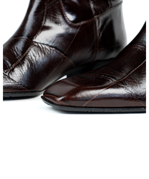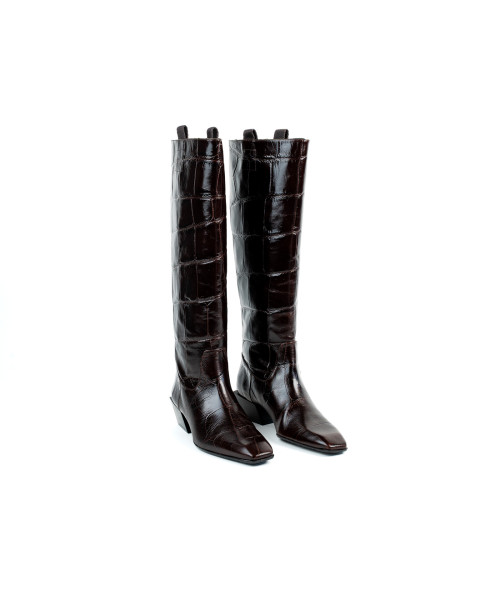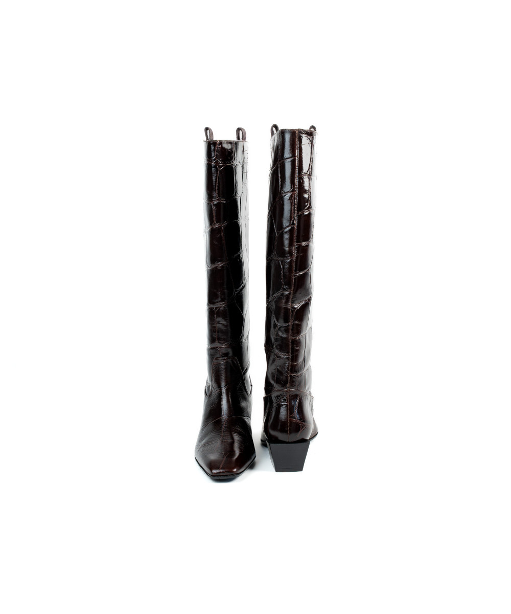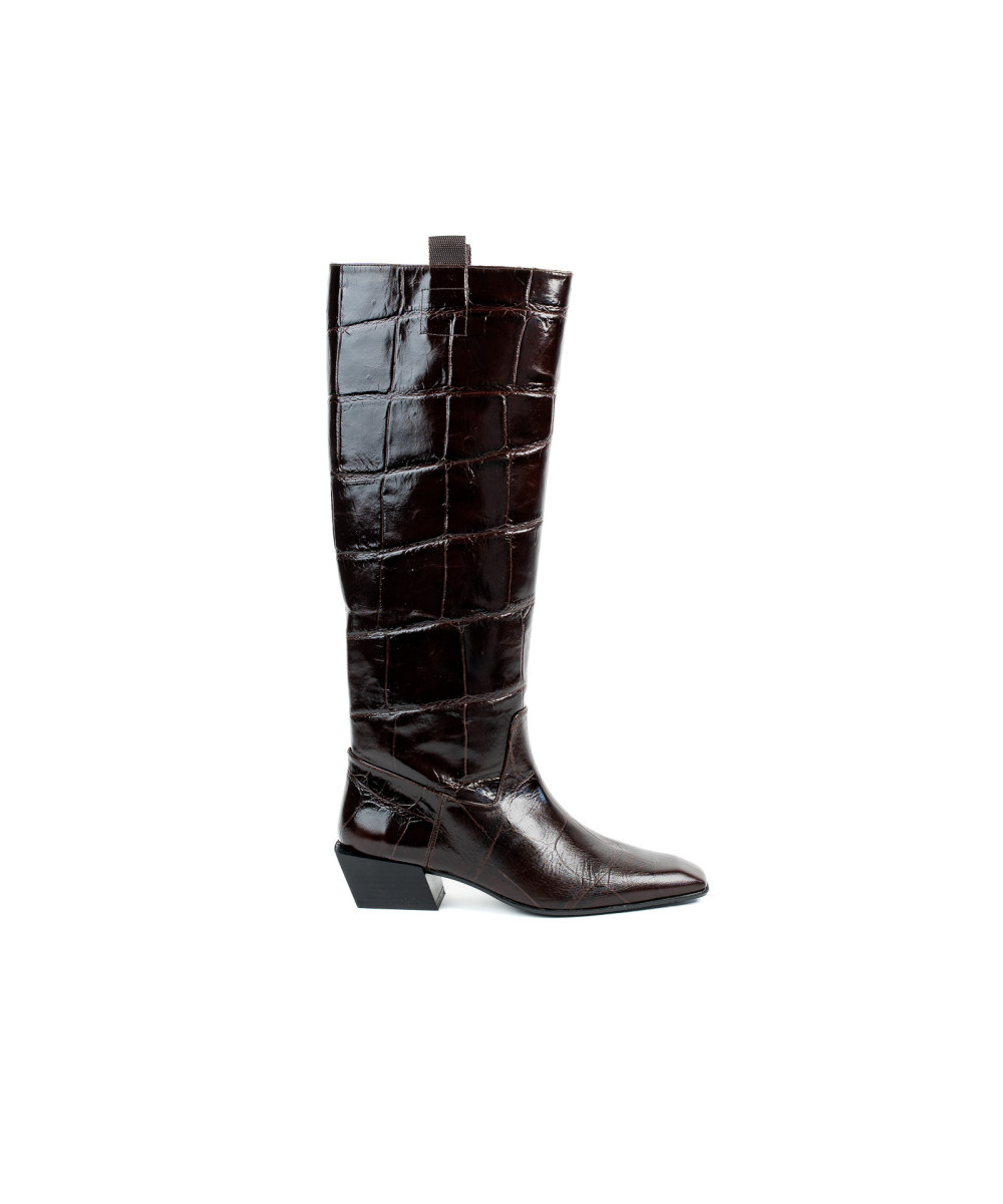 Bota fabricada en piel grabada. Diseñada en una elegante punta fina, se caracteriza por su sencillez y elegancia. Este modelo se ajusta fácilmente para poder vestirlos y llevarlos cómodamente junto con el tacón medio de 3,5 cm.