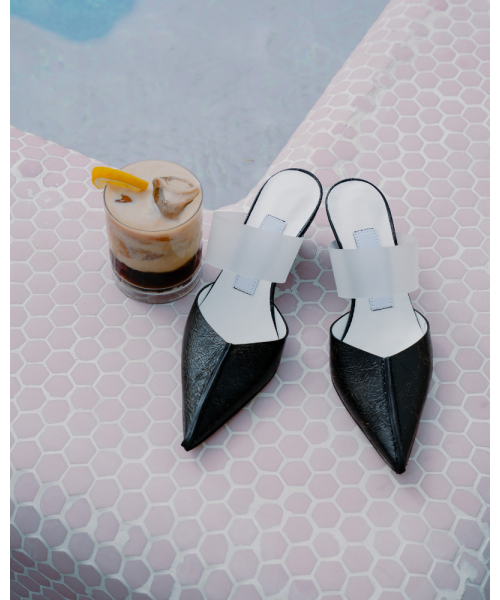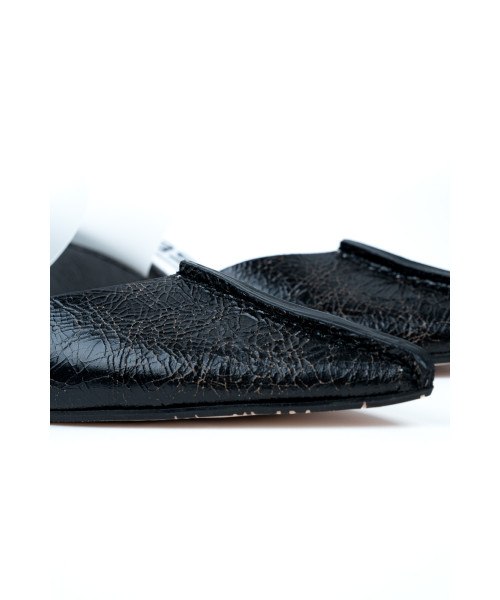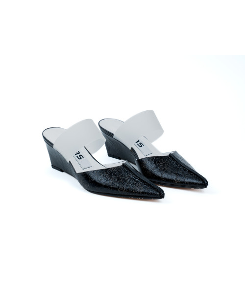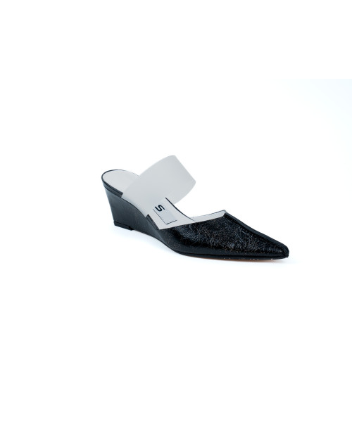 Salón destalonado de color negro craquelado elaborado en piel. Diseñado en punta, este original diseño se caracteriza por su linea vertical en el mismo color situada en la puntera. Se sujeta al pie con una tira en transparente que pasa por encima del empeine, facilitando así su calce. Está completamente forrado en piel y tiene suela de goma.