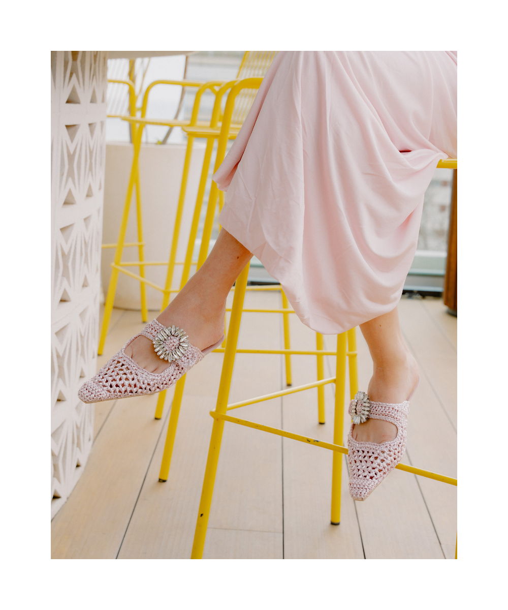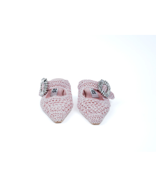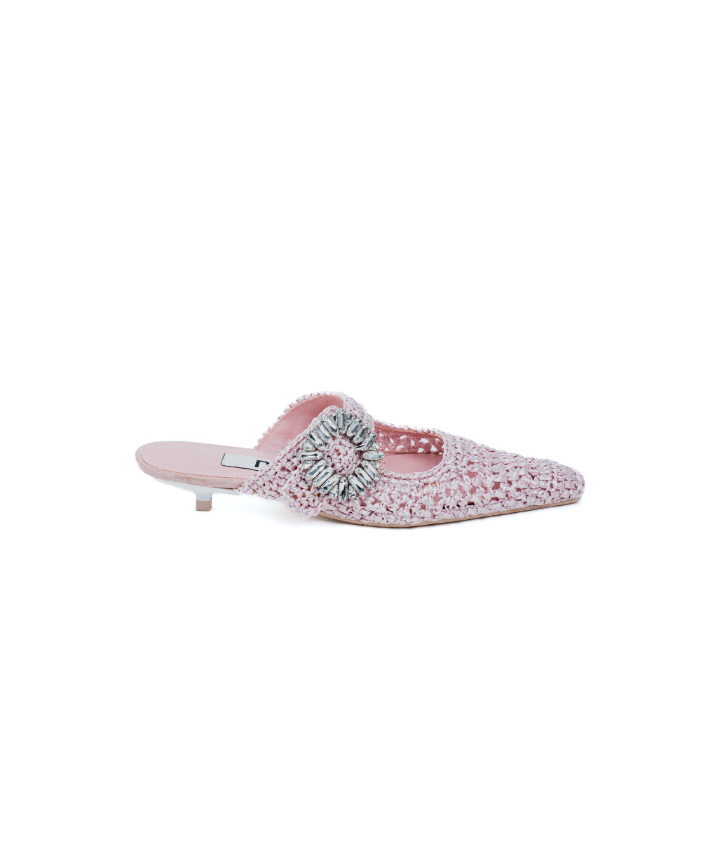 Salón destalonado de color rosa elaborado en rafia. Diseñado en punta, este original diseño de ganchillo trenzado a mano está decorado con un llamativo y brillante adorno de pedrería que conforma la falsa hebilla. Está completamente forrado en piel y tiene suela de goma.