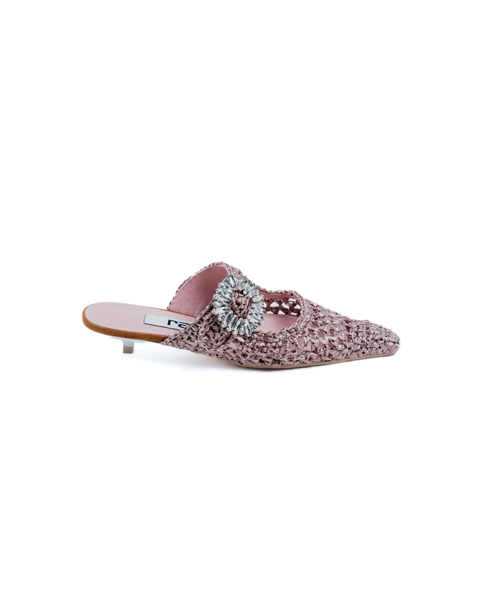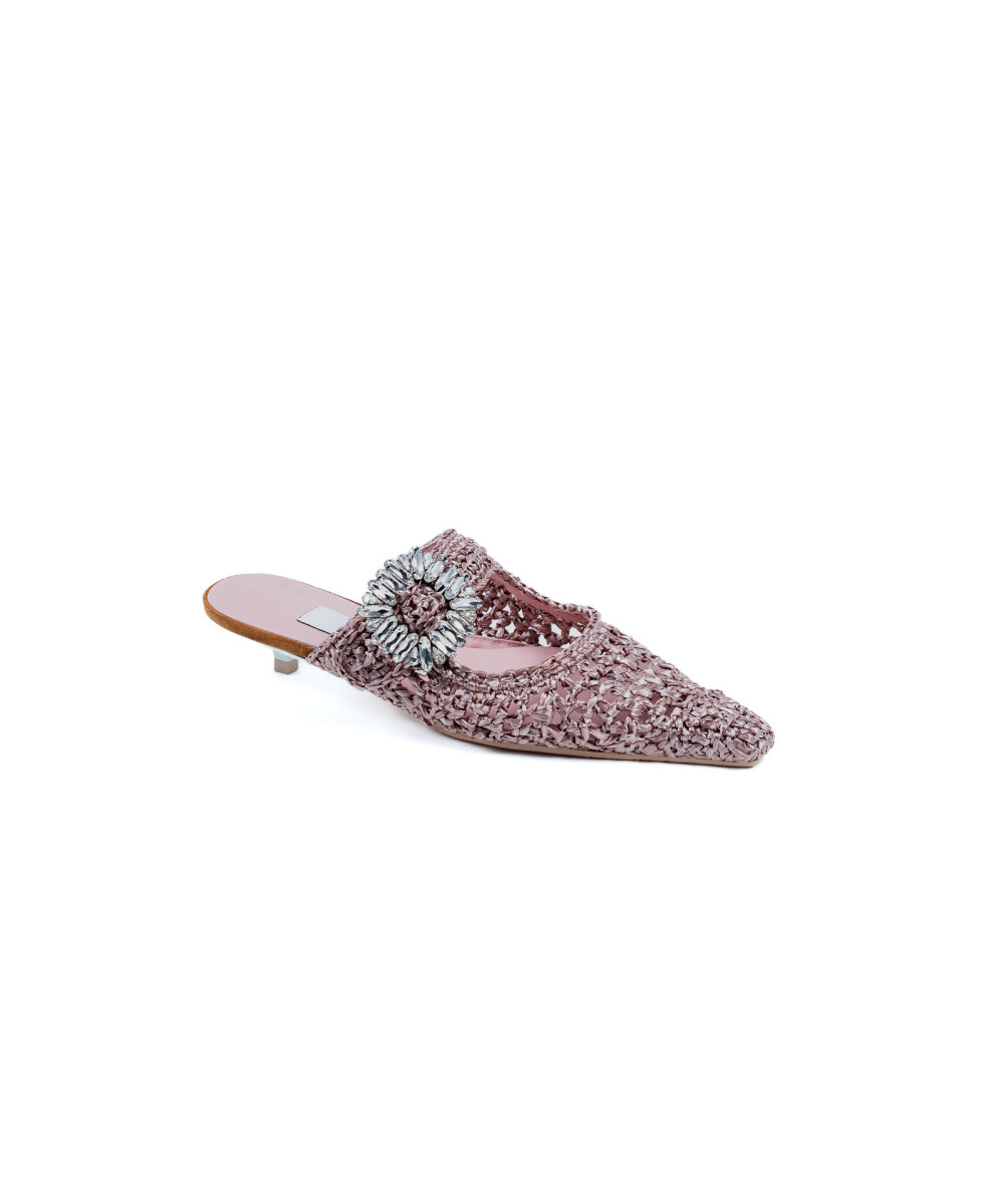 Salón destalonado de color tabaco elaborado en rafia. Diseñado en punta, este original diseño de ganchillo trenzado a mano está decorado con un llamativo y brillante adorno de pedrería que conforma la falsa hebilla. Está completamente forrado en piel y tiene suela de goma.