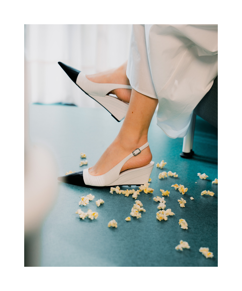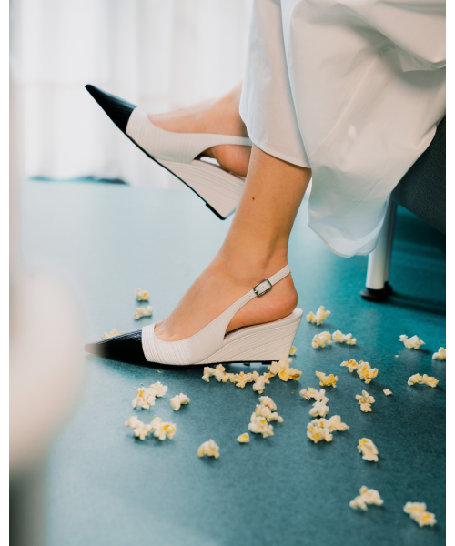 Salón destalonado de color blanco elaborado en piel. Diseñado con una elegante punta en pico, este original diseño destaca por el contraste con su puntera en color negro. Se sujeta al pie con una fina tira trasera con hebilla ajustable. Está completamente forrado en piel y dispone de una cómoda suela de cuña.