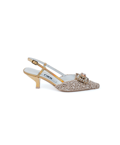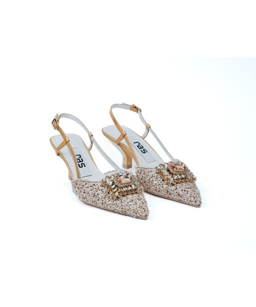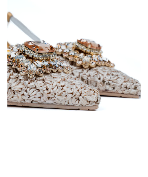 Salón destalonado de color arena elaborado en rafia. Diseñado en punta, este original diseño de ganchillo trenzado a mano está decorado con un llamativo y brillante adorno de pedrería. Se sujeta al pie con una fina tira metalizada trasera con hebilla ajustable. Está completamente forrado en piel y tiene suela de goma.