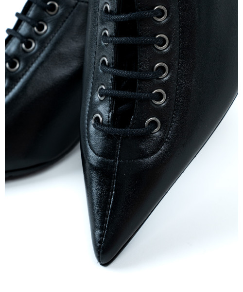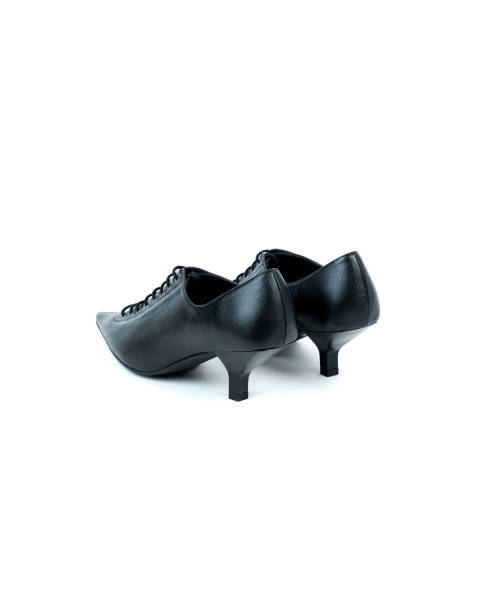 Salón fabricado en piel de color negro. Diseñado en una elegante punta fina, se caracteriza por ser un zapato atemporal. Este modelo se ajusta gracias a unos cordones situados en la zona delantera para llevarlos cómodamente junto con el tacón medio de 5 cm.